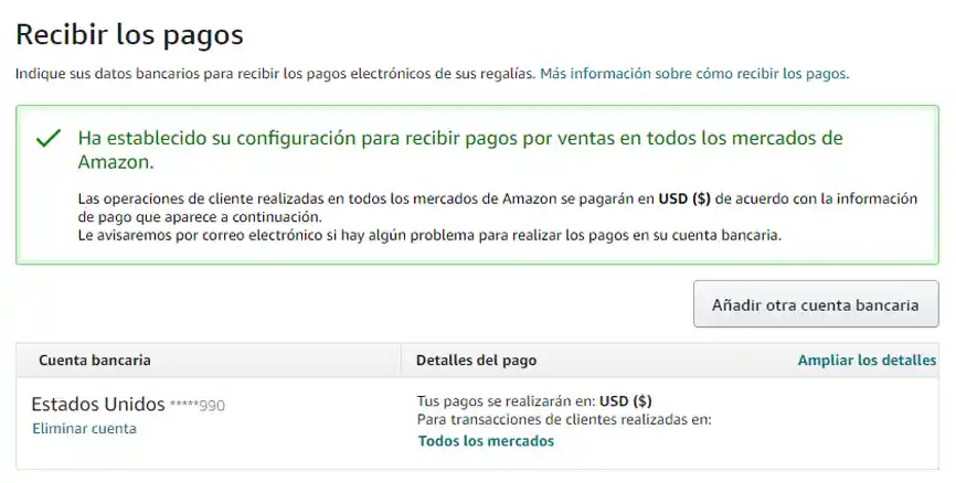Una vez agregada la cuenta bancaria, KDP le informará qué opciones de pago tiene disponibles.